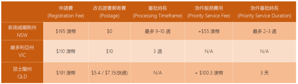 有些州可以加錢急件審批,比如雪梨所在的新南威爾斯州,改名審批的費用為195澳幣含運費(約台幣4000多), 加55澳幣急件可以最快兩週批下來; 布里斯本所在的昆士蘭州,審批費用為191澳幣,加一般運費5澳幣或快遞7澳幣,急件加價100澳幣,最快可以2天批下來; 而墨爾本所在的維多利亞州,則是審批費用統一110澳幣,加上郵費10澳幣,沒有急件選項。