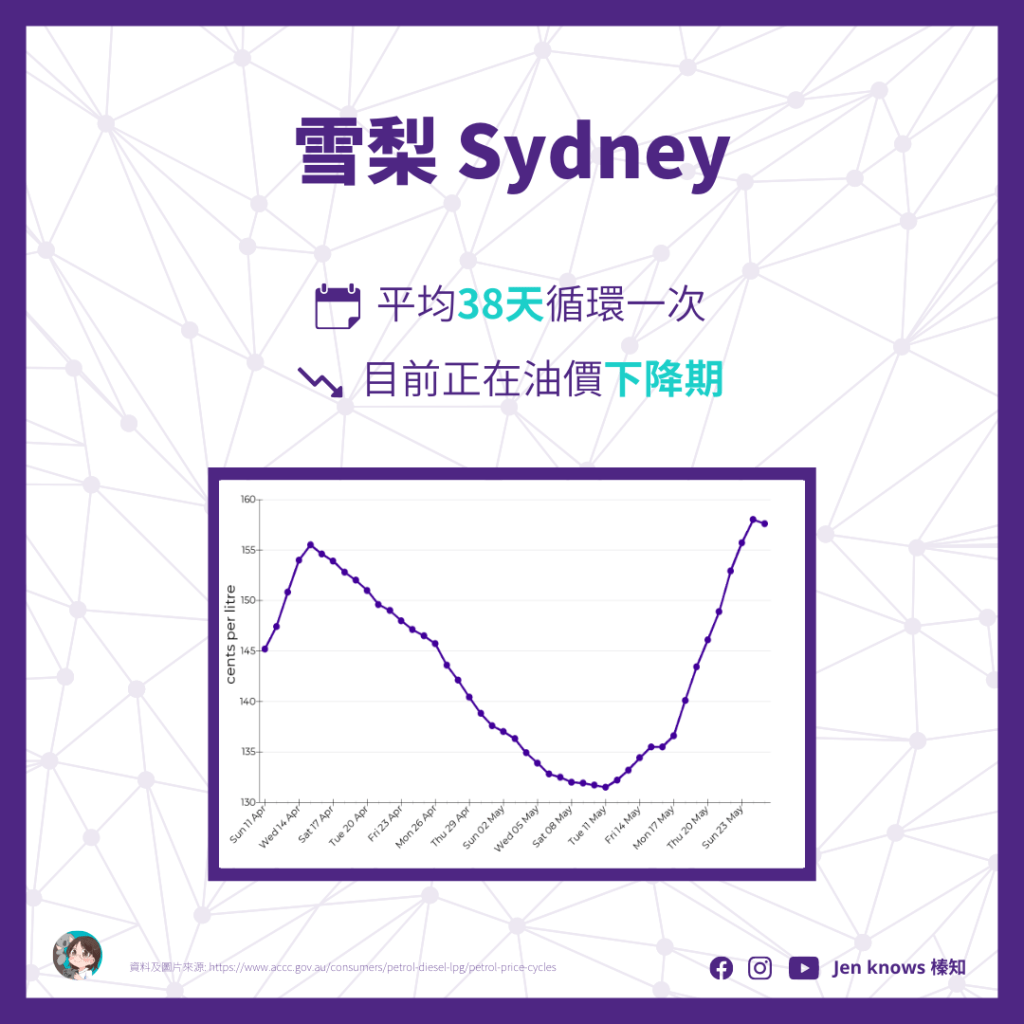 📌布里斯本的油價週期會短一點,平均33天,目前則是在油價下降期。