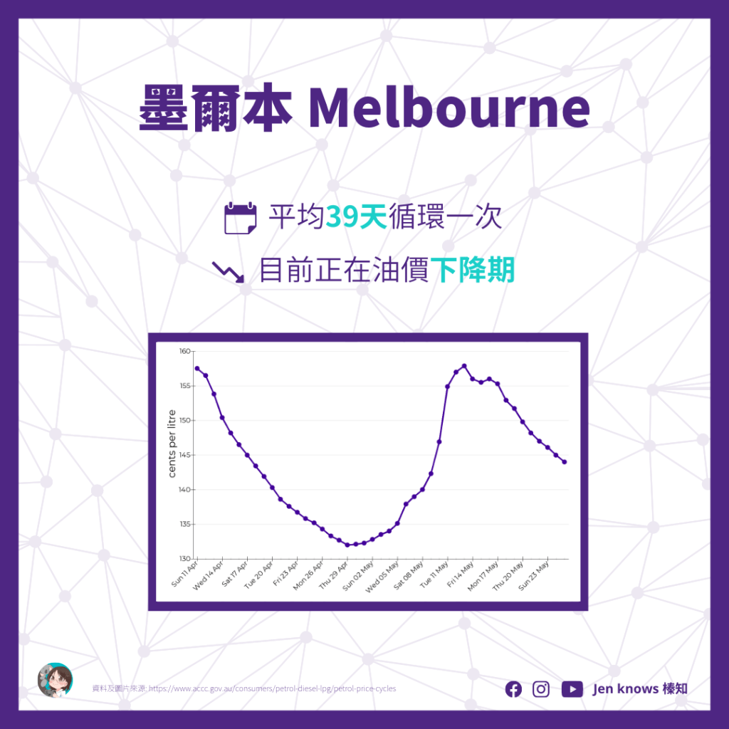 再來是📌墨爾本,平均也差不多,39天循環一次,目前則是在油價下降期。