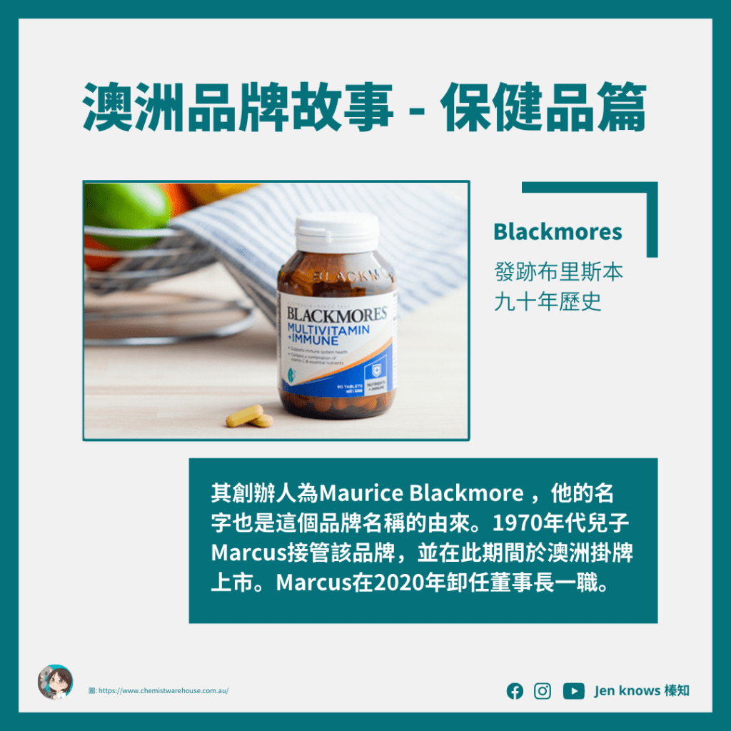 剛來澳洲的時候印象最深的就是Blackmores,因為Chemist Warehouse總是有一大片位置擺著他們家琳瑯滿目的產品。也因為他們家產品線齊全,加上經常打折,現在也是我自己有時候會買來吃的牌子。
