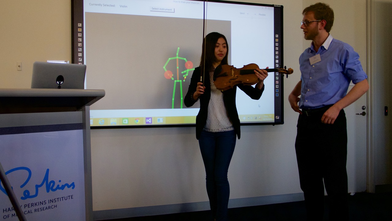 結果,我好死不死是第一場。因為帶了一堆器材 (Kinect,筆電還有小提琴) ,所以問他們能不能事先測試,結果只有十分鐘不到,還好一切運作都很正常。