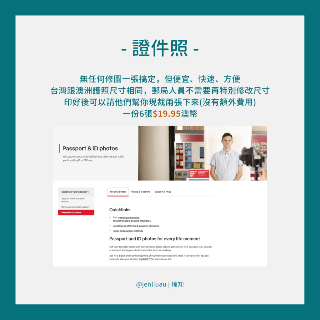 第一個要跟大家分享的就是照證件照的服務,一次$19.95澳幣,但不是所有的郵局都會提供,建議大家事先在澳洲郵政官網查詢有提供此服務的郵局。