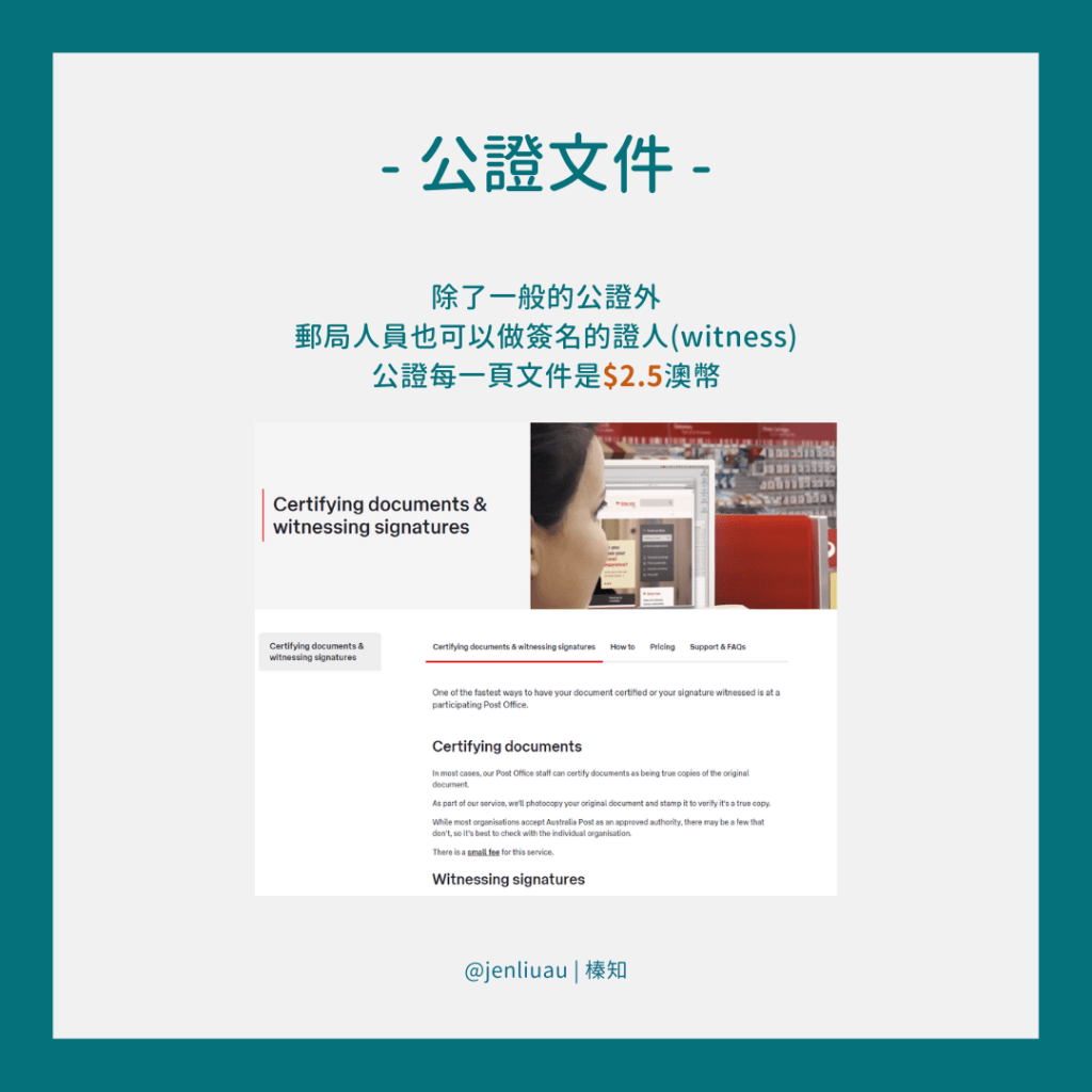 在澳洲,要申請很多事項都要做文件公證,比如簽證。如果你沒有認識的JP(太平紳士),大部分的郵局都有員工可以幫你公證(certify),每一頁文件(單頁或雙頁)是$2.5澳幣。除此之外,如果你在申請東西的時需要證人(witness)幫你證明簽名的真實性,郵局的員工也可以做證人,只是具體要看該組織對證人的要求。