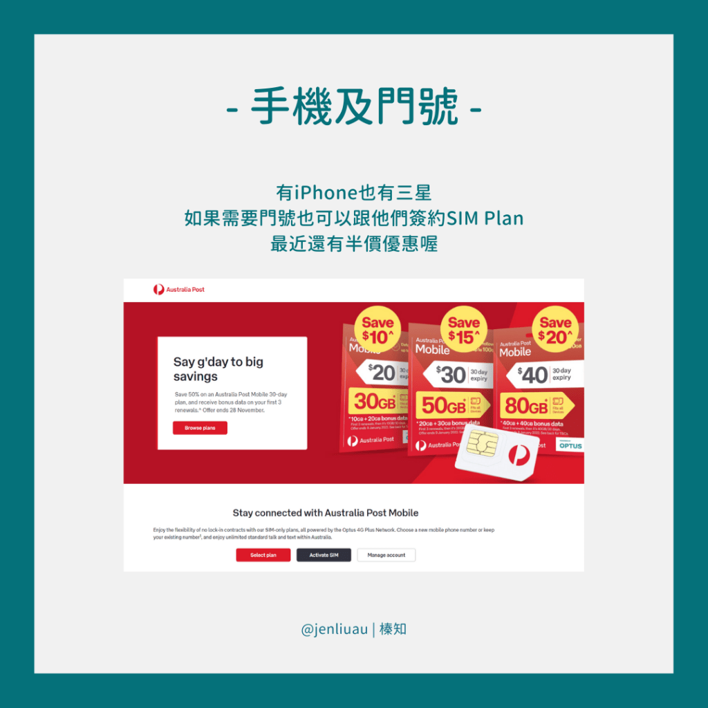 澳洲郵政還有賣手機,而且不是只有老舊的款式,最新的有到第二代iPhone SE還有三星Galaxy A12。如果你不想買手機,只想來張SIM卡也沒問題,澳洲郵政也有多款方案可以選擇。為了寫文章我還查詢了一下,最近剛好在特價,月租$20有80GB流量(前三個月),算是還不錯。最後說一下,澳洲郵政的網路是用Optus的,所以不用太期待它的覆蓋率。