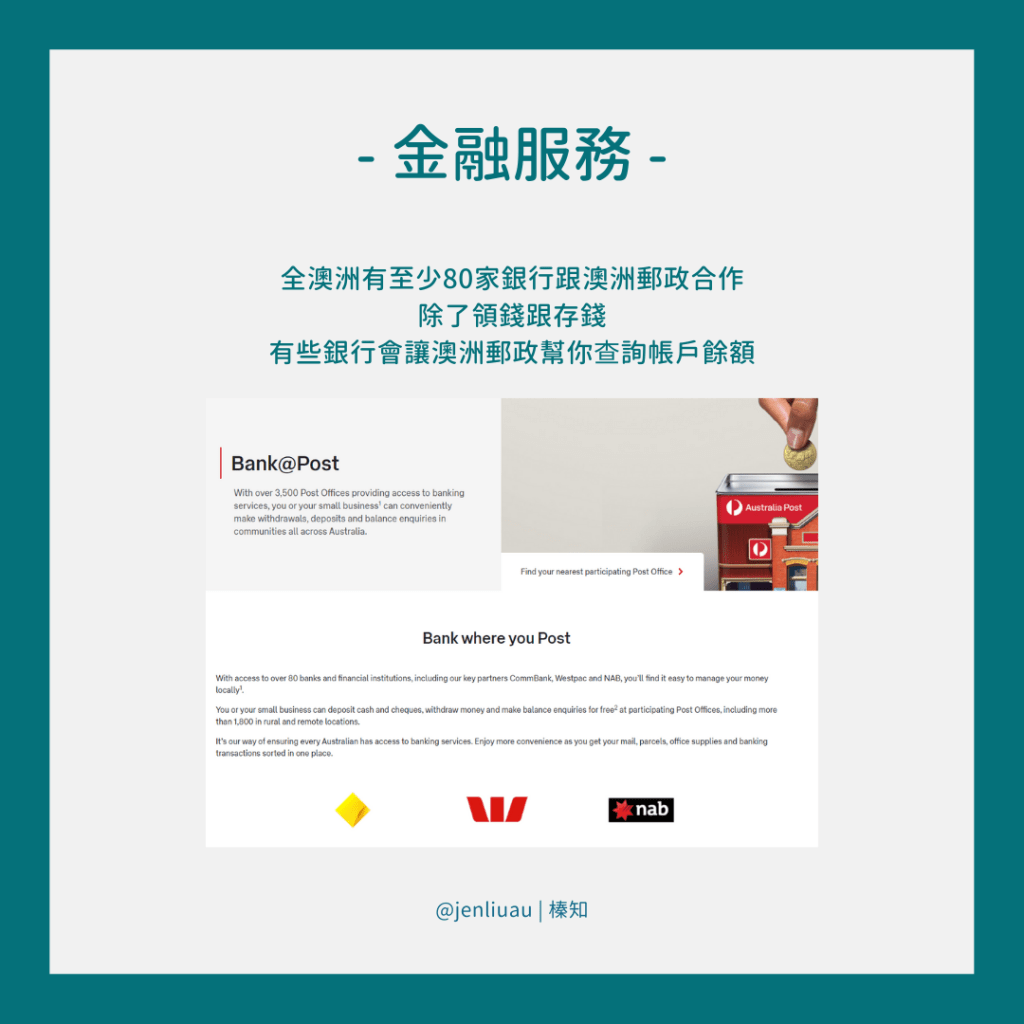 最後要跟大家分享的是金融服務。澳洲郵政有跟全澳洲80家以上的銀行合作,如果你在偏鄉地區,附近沒有ATM,可以直接去澳洲郵政領錢。大部分的銀行都有支持直接拿銀行卡去郵局領錢跟存錢的服務,也可以接收支票,有些合作銀行甚至有開放澳洲郵政查詢帳戶餘額,還有進行小型公司存款的業務。具體合作銀行可以上澳洲郵政官網查詢。
