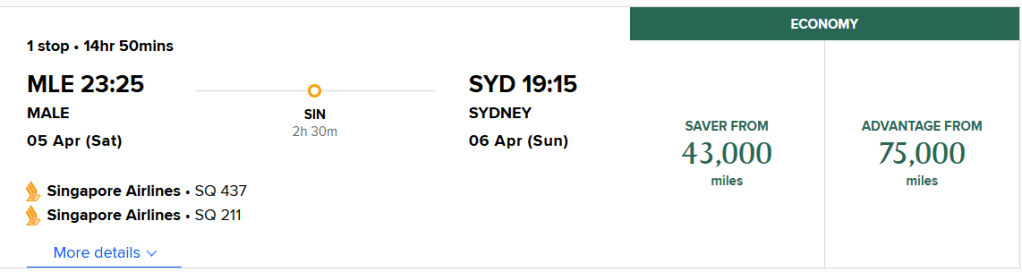 從馬爾地夫回雪梨的路線比較簡單,因為沒什麼選擇,就是新加坡轉機回雪梨,剛好把本來幫隊友換商務艙去歐洲的點數用在這邊,再自己從Virgin轉補一點過來,兩個人總共是150,000點,加上$270美金的稅金