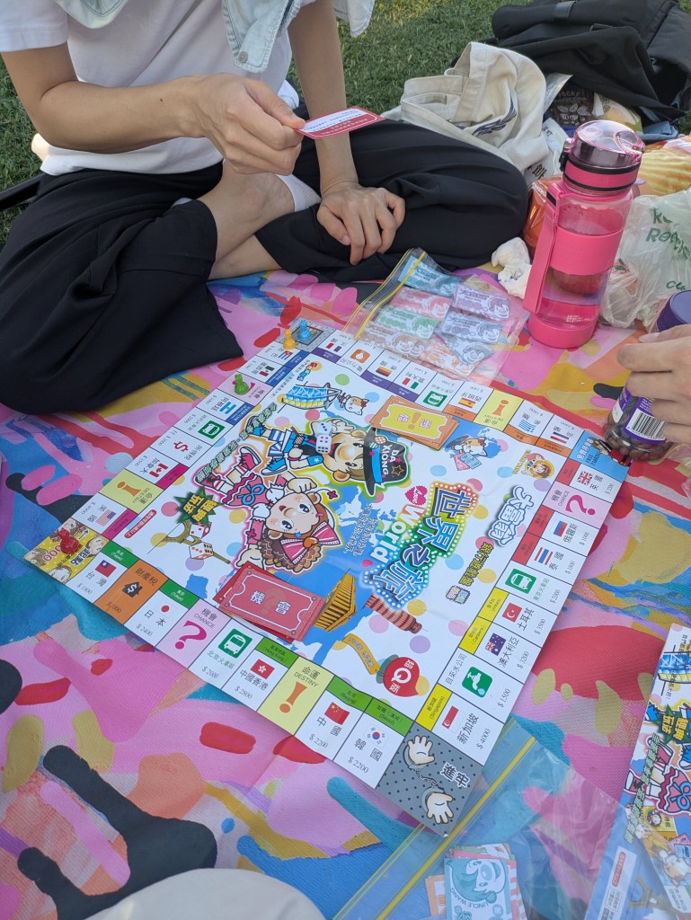 這邊其實是一個球場,所以球場邊緣靠近海灣的地方有柵欄跟小門,我們這次是把腳架架在碼頭右邊,然後人平常在藍色框框的位置(柵欄裡面的草地),鋪開野餐墊玩桌遊。這樣離門比較近,也可以隨時看到腳架那邊的動向