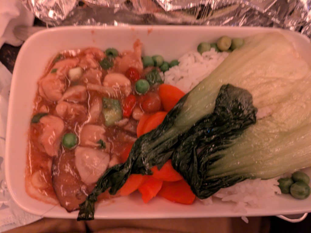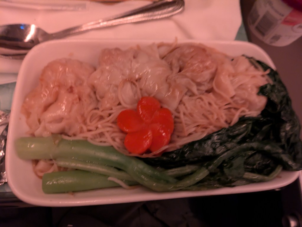 中式主食居然是鮮蝦雲吞撈麵,雲吞超大顆超好吃,意味的是蔬菜很Juicy不像平常飛機上吃到的很乾。