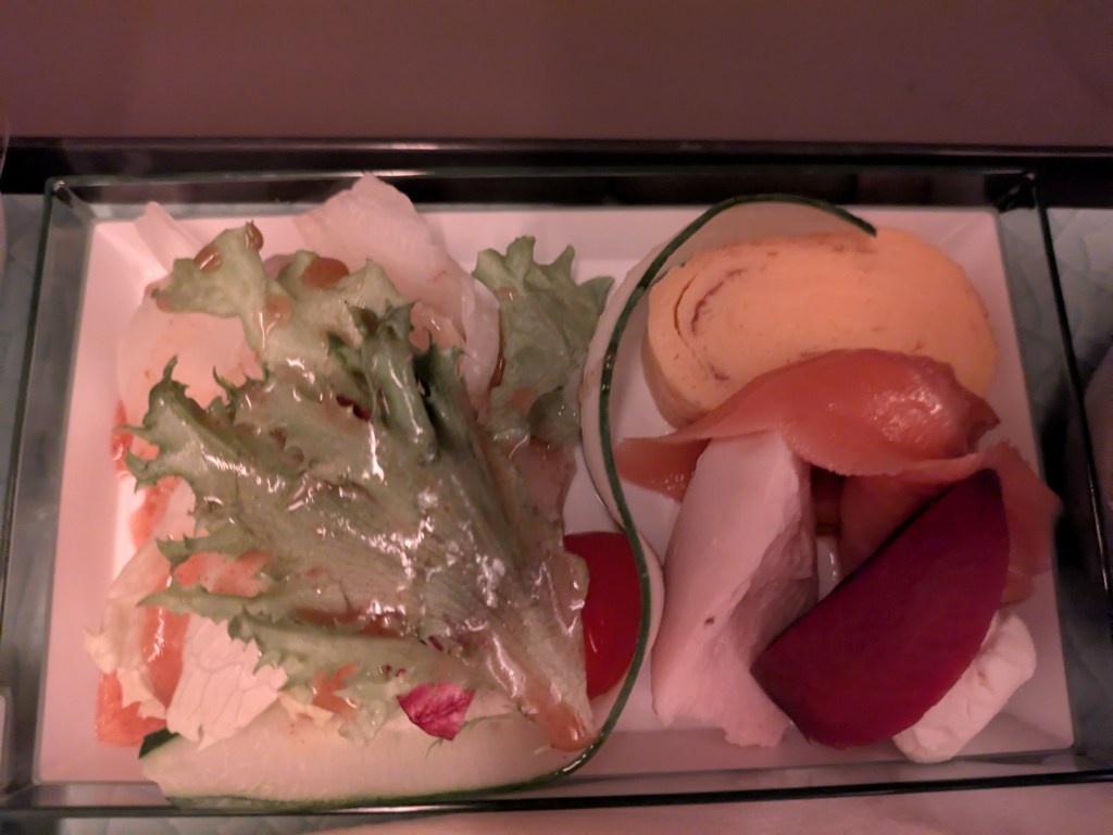 最讓我驚艷的是配菜,除了沙拉以外,居然還有玉子燒、煙燻鮭魚跟起司,這些我以為商務艙才吃得到的東西,而且味道蠻好的