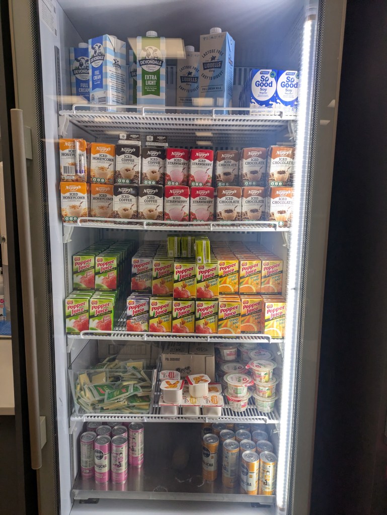 這次去我更發現,飲料區已經不只是調味乳跟果汁而已,還多了豆奶、低脂牛奶等選擇;冰箱裡還有起司、優格,有時候甚至連現在很流行的 Kombucha都出現了。