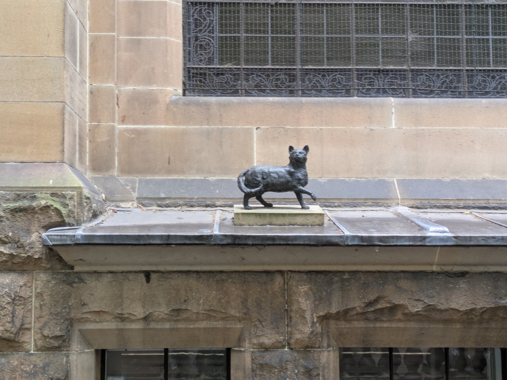 到達新州圖書館外面時,導遊海哥先帶我們到側邊,指著牆上一座人物及後面的小貓雕像說:「這就是馬修.福林達斯跟他的寵物。」