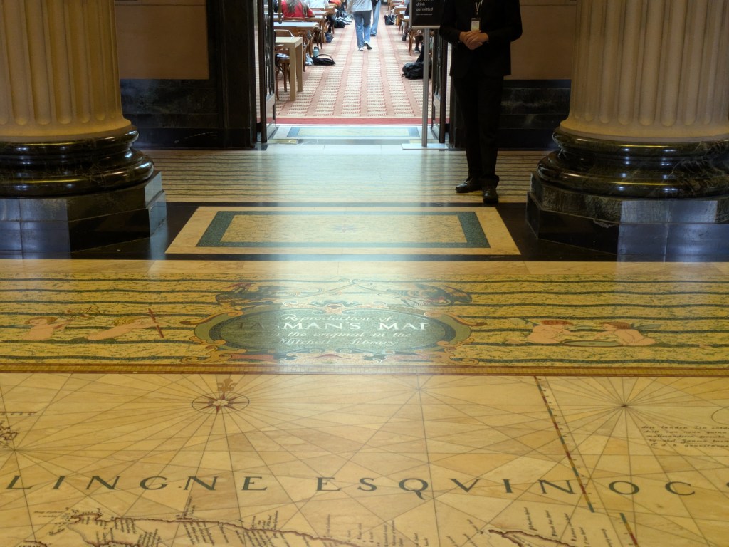 那幅壯觀的大理石鑲嵌地圖,就鋪在入口大廳的地板上,像一張歷史與藝術交織的迎賓地毯。它不只是裝飾,而是把歐洲人對南方大陸早期的認識,攤開在每一個走進圖書館的人腳下,也讓這裡成為雪梨最獨特的公共藝術之一。