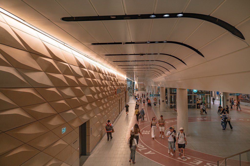 天花板、牆面、地板,三個維度一起出手,聯手把一個本來只是「轉車點」的地方,變成一座會說話的車站。
