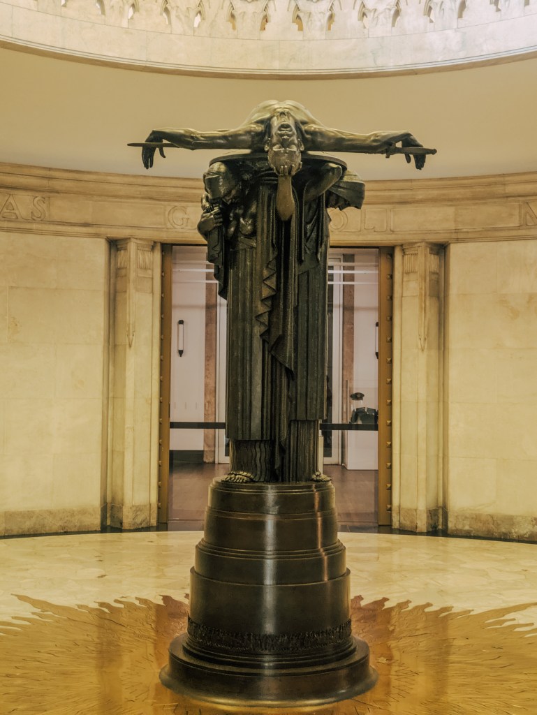 這種雕塑形式被稱為「女像柱」(Caryatids)。一個骨瘦如柴的男性,躺在石柱上,身下還有一把長劍,象徵戰場上的士兵。