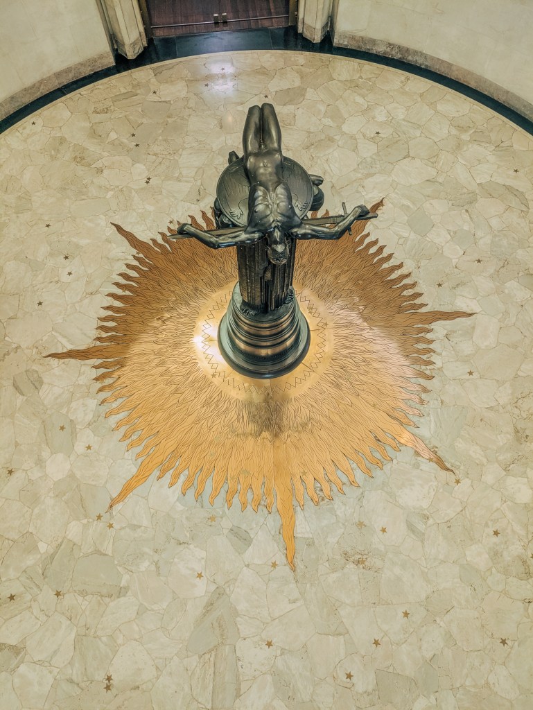 跟著導覽走進新州圖書館,我先在館外遇見福林達斯雕像,再踩上館內的大理石《塔斯曼地面地圖》。回…
