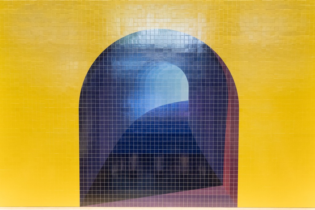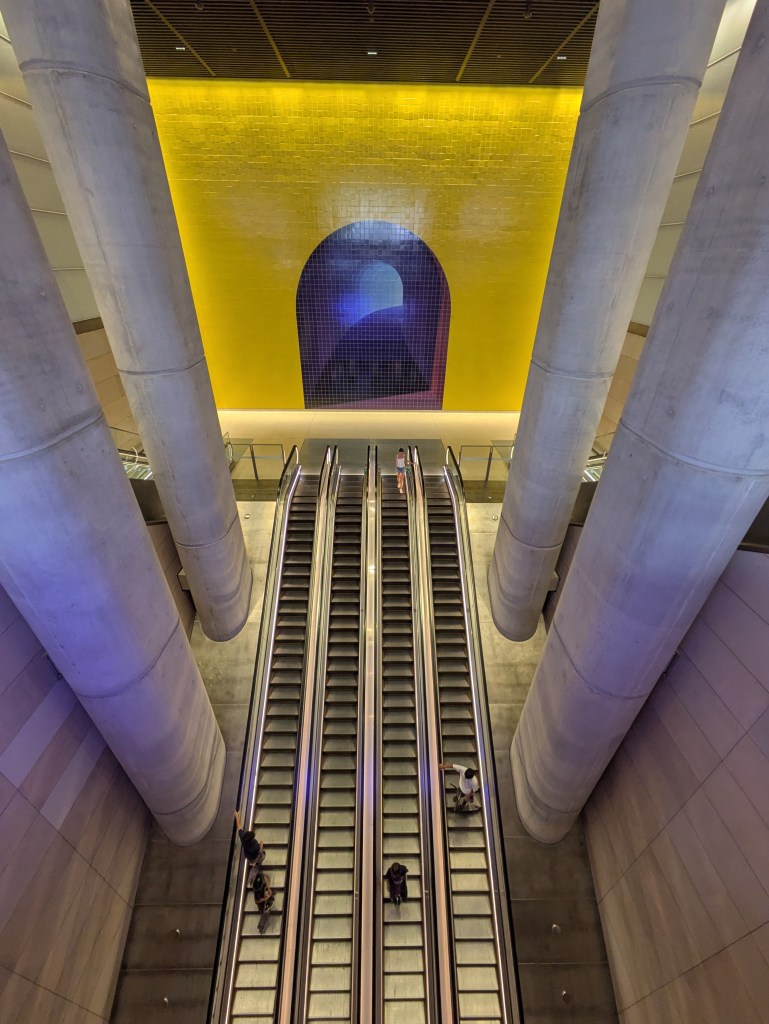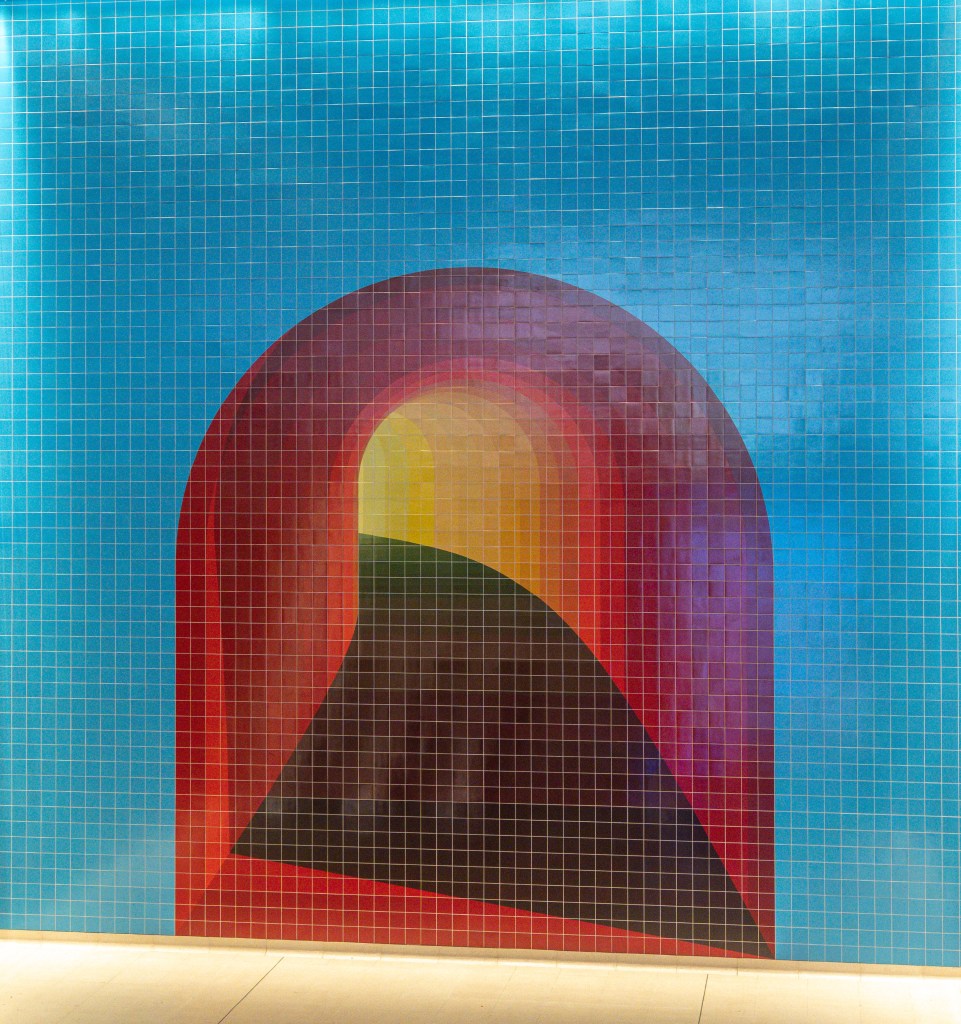 入口牆面那組 13 公尺高的作品 The Underneath,由上萬塊磁磚構成,畫面是「隧道」意象,指向雪梨早期的鐵路基礎建設。