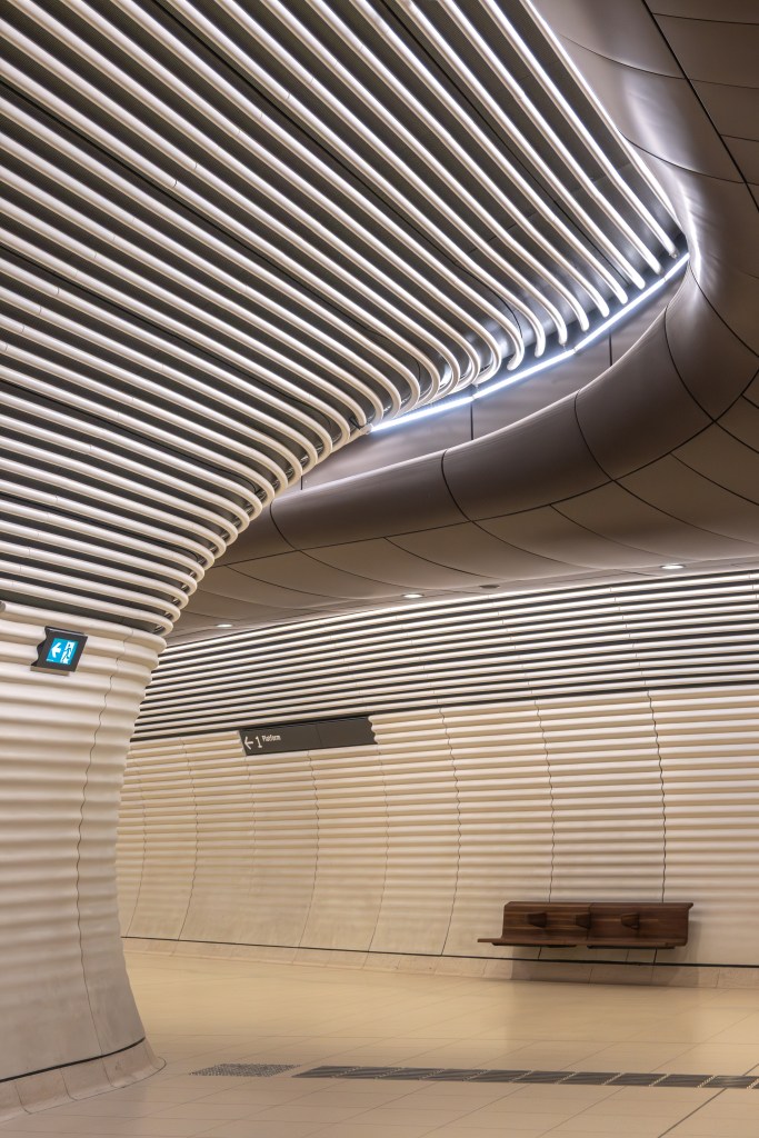 在地下車站的設計中,天花與牆面的材質配置,本來就需要同時考量聲學,避免回音過重、讓廣播與人聲混成一團。