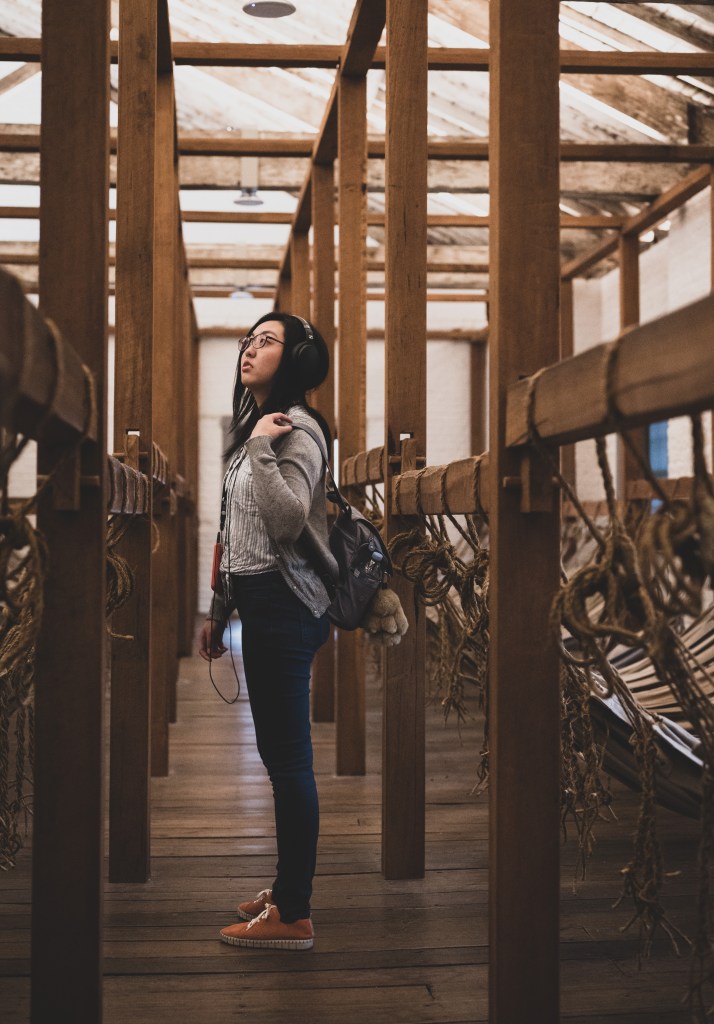 最讓我驚喜的,是那些環境音。只要現場沒有在介紹展品,耳機裡就會自動切換成軍營過去的聲音:犯人夜裡的咳嗽聲、工具敲打木頭的勞作聲、老鼠竄過的吱叫聲……一層一層疊上來,彷彿真的有人在你身邊活動。