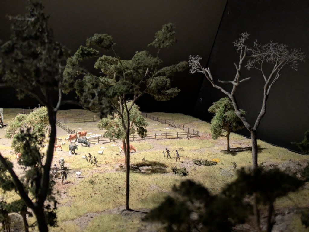 其中一個來自藍山方向、Bathurst 一帶的模型讓我看了很久。正在開墾的歐洲殖民者,看到原住民路過,出於好意,把自己剛採收的馬鈴薯送給他們。對他來說,那是「送你們一點我的收成」。