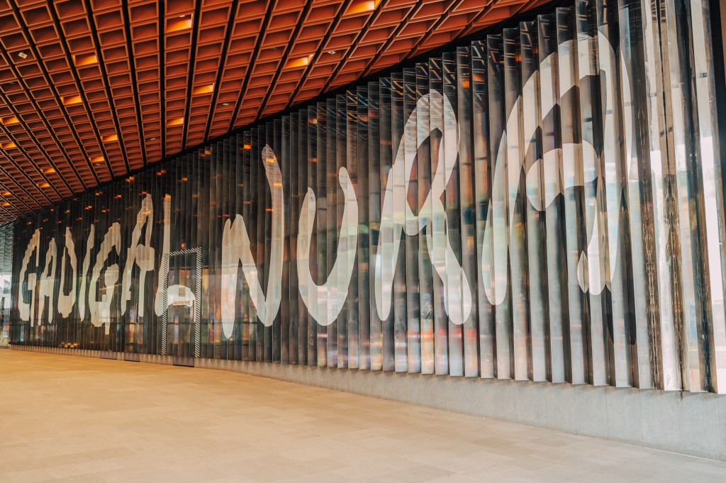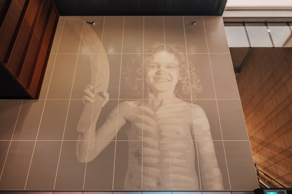沿著扶梯慢慢往上一層,來到一樓大廳,映入眼簾的,是牆上幾個超大的字:「Gadigal Nura」。