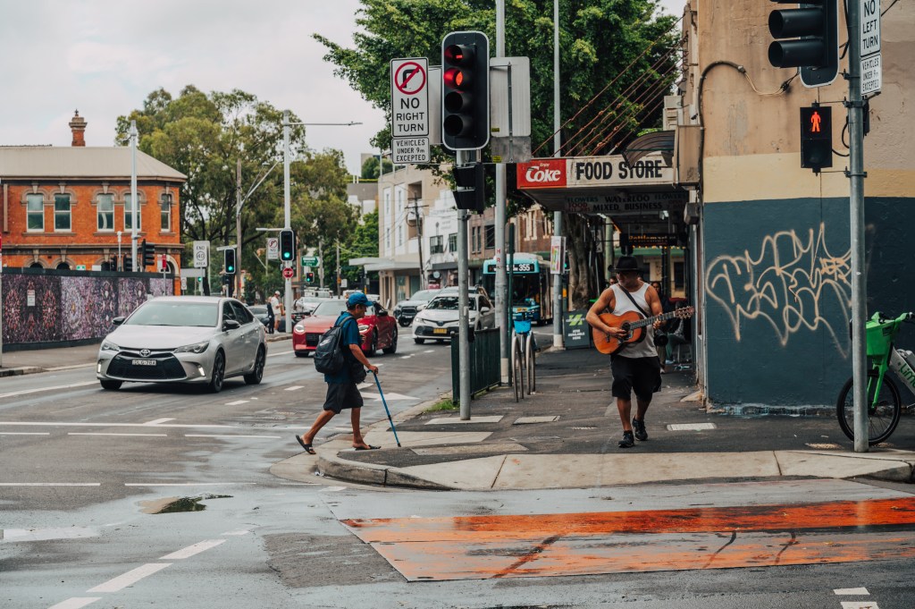 剛才還沉浸在「Footprints on Gadigal Nura」的藝術脈絡裡,下一秒就被丟回一個很粗糙、很真實的街區。