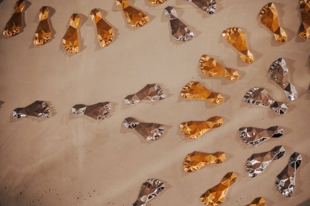 整面牆上是一個接一個金銀雙色的腳印裝飾,被排列成原住民畫作那種幾何形的圖案,在燈光照映下真的會閃。